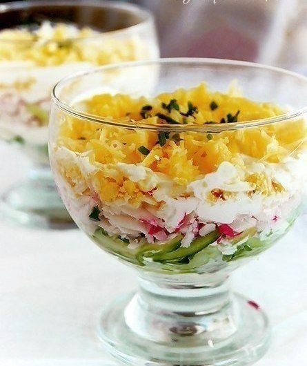 Салат выкладывается слоями: