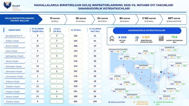 В пресс-службе Налогового комитета Республики Узбекистан сообщили, что по итогам ноября 2025 года в информационной системе "Деятельность налоговых органов в махаллях" показатель эффективности (KPI) налоговых инспекторов составил 73,6 балла. Данные приведены в рамках работы системы "махаллабай", которая используется для оценки результативности инспекторов, закреплённых за махаллями, и формирования общего рейтинга по регионам.
