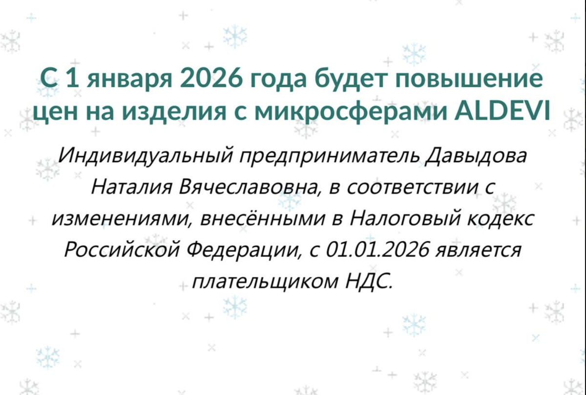 Изменения в ценах с 1 января 2026 года Здравствуйте, дорогие друзья и ценители изделий с микросферами ALDEVI! Мы, индивидуальный предприниматель Давыдова Наталия Вячеславовна, хотим заранее проинформировать вас о предстоящих изменениях в ценовой политике. С 1 января 2026 года стоимость нашей продукции будет скорректирована. Почему происходят изменения? Это связано с изменениями в налоговом законодательстве Российской Федерации. В соответствии с обновлениями Налогового кодекса, с 1 января 2026 года я, как индивидуальный предприниматель, становлюсь плательщиком НДС (налога на добавленную стоимость). Это означает, что в стоимость изделий ALDEVI будет включен НДС, что, к сожалению, приведет к небольшому повышению цен. Что такое ALDEVI и почему наши изделия особенные? Если вы еще не знакомы с нашей продукцией, то ALDEVI – это изделия, созданные с использованием уникальных микросфер. Они обладают рядом преимуществ. Мы гордимся качеством нашей продукции и стремимся предлагать вам только луч