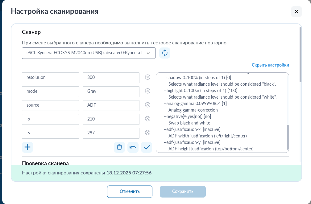 Я продолжил работу над настройкой МФУ Kyocera для проведения ГИА и разобрался, как подключить сканер МФУ Kyocera 2040dn к программе “АРМ ГИА-11 в ППЭ”. После нескольких попыток и изучения чатов технических специалистов, я нашел решение. Необходимо установить дополнительные параметры в программе, которые явно указываю как именно должен сканировать сканер: Параметры для МФУ Kyocera ECOSYS M2040dn:
