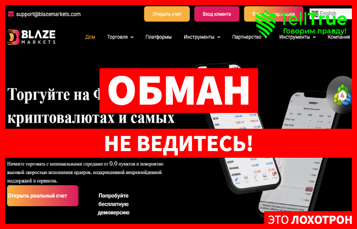 Очередные Форекс мошенники громко на своем сайте пишут «Торгуйте на Форексе, криптовалютах и самых популярных рынках.». Брокерская компания Blaze Markets (blazemarkets.com) уверяет клиентов, что уровень прозрачности ее работы высочайший, рисует красивые статистические данные и обещания, но при этом стоит быть внимательнее, поскольку перед нами типичные мошенники. И таких проектов есть полно, так что с ними работать категорически не стоит. заработать на этом сайте деньги нельзя, а вот потерять существенные суммы легко. Полный обзор: https://telltrue.net/eto-lohotron/blaze-markets/