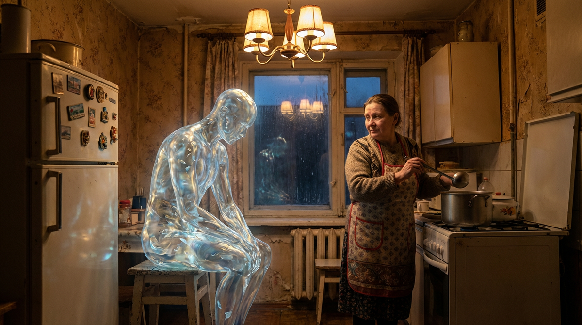 Посреди кухни, прямо между холодильником «Саратов» и обеденным столом, стоял он. Или оно. Существо было высоким, худым, словно вытянутым из стекла. Его кожа (или костюм?) переливалась перламутром, как бензиновая пленка в луже. Лица как такового не было — лишь гладкая, овальная поверхность, на которой время от времени вспыхивали мягкие огоньки.