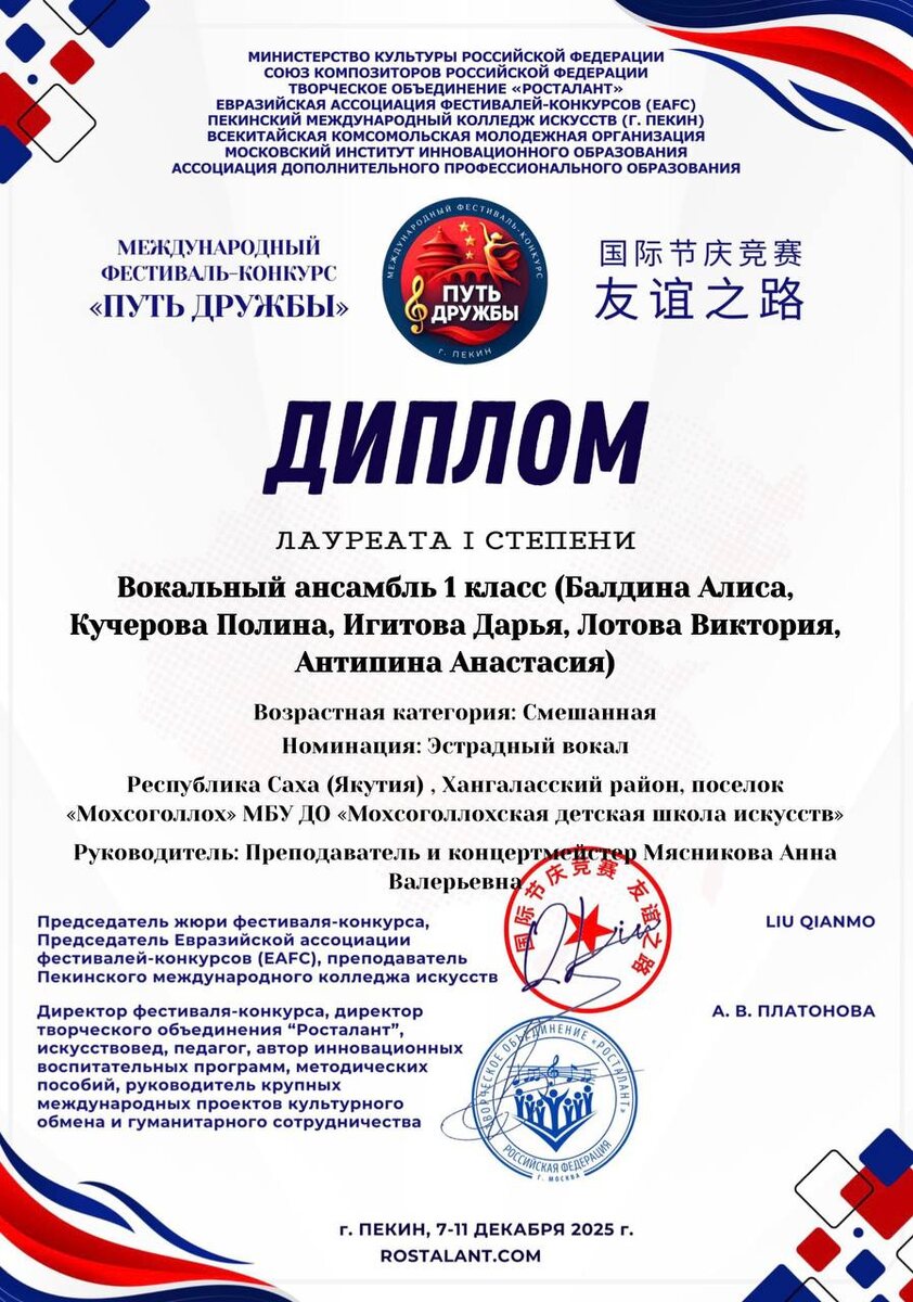 ! 🇨🇳🥇 Вокальная группа учащихся 1 класса Мохсоголлохской детской школы искусств, показала высокие результаты на международном фестивале-конкурсе «Путь дружбы», проходящем в г. Пекине. Этот яркий праздник музыки и творчества объединил юных артистов из России и Китая, став важным этапом культурного обмена и формирования понимания друг друга. 👏🏼🌸 🇨🇳 Данный фестиваль-конкурс проходит под патронажем крупных организаций и учреждений России и Китая, среди которых Министерство культуры Российской Федерации, Союз композиторов РФ, Евразийская ассоциация фестивалей-конкурсов EAFC, Пекинский международный колледж искусств, Всекитайская комсомольская молодежная организация, Московский институт инновационного образования и Ассоциация дополнительного профессионального образования. Такое представительство подчеркивает важность соревнования и высокую конкуренцию среди участвующих коллективов. 💫👏🏼 https://t.me/MoxDSHI2022/658