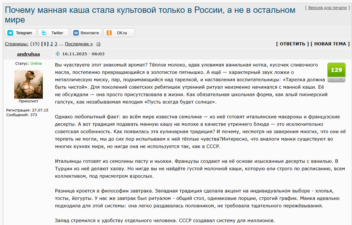 Каждый второй блогер, не считая первого, спешит рассказать, что манную кашу едят только в России и постсоветских странах. Вот прямо классический пример: