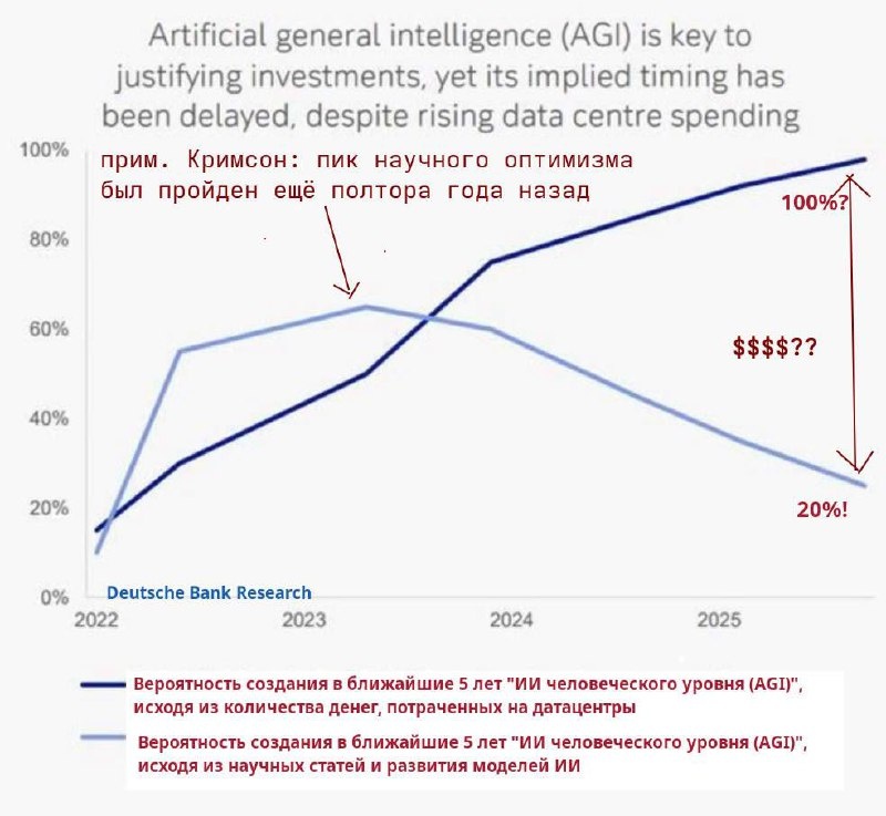 Я еще полтора года назад сомневался в том что «это будущее» и «нейросети заменят нас всех», и последовательно топил за это От того мне так приятно, когда выходят подобные аналитические исследования, подобные тому что опубликовал Кримсон Связано оно с двумя кривыми: 1. Это научный оптимизм относительно того что будет создан «реально умный ии» назовем этот так, для упрощения 2. Вторая же показывает объем инвестиций, но можно это воспринимать как «хайп», «спрос», «вера в чудо» у рынка А дельта, образовавшаяся к текущему моменту - показывает как сильно напряжен этот финансовый пузырь. И как смачно он должен схлопнуться в ближайшем будущем Но как же я понял ещё несколько лет назад, что технология хоть и полезна, но точно её значимость и возможности - преувеличены? Да все просто. Отмотайте немного назад. Для простоты мы возьмем две близлежащие к нам технологии: биткойн и интернет (можно было и простейшую лампочку взять, но будет сложнее) Когда прорывная технология появляется - в обще