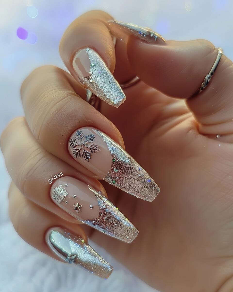 , translucent “glass” base with chrome pearl glaze, micro-glitter gradient, 3D gel snowflake accents, holographic foil flakes, icy aura effect around cuticles, fine silver linework, subtle velvet-matte + glossy contrast, one statement nail with raised snowflake and tiny crystals, clean hydrated skin, luxury jewelry minimal rings; composition: top-down close-up, fingers gently curved, nails centered and tack-sharp, shallow depth of field, soft winter bokeh background (cool white + ice blue), lighting: diffused softbox key + crisp specular highlights for glitter, high clarity, high color fidelity, editorial beauty retouch, modern 2025 nail art trend aesthetic --ar 4:5 --v 6 --style raw --stylize 150 --q 1 --no text, logo, watermark, extra fingers, deformed hand