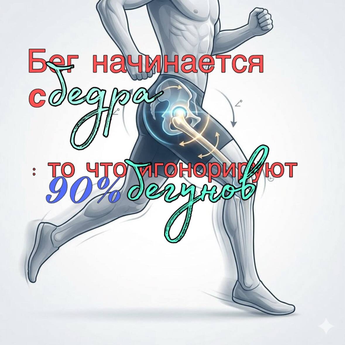 Представьте, что тазобедренный сустав — это «дирижёр» всего движения в беге. От того, как он сгибается, разгибается, вращается и стабилизируется, напрямую зависит работа колена и стопы, а значит — экономичность бега и риск травм. Что происходит с бедром во время бега? В момент касания стопы земли бедро уже согнуто примерно на 30° и остаётся в этом положении около трети фазы опоры. В это время тело «проседает» вниз в основном за счёт колена, а тазобедренный сустав работает как стабилизатор. Затем, во второй половине опоры, бедро начинает активно разгибаться — именно здесь мы получаем продвижение вперёд и вверх. Интересный момент: движения бедра, колена и стопы не синхронны. Колено и голень вращаются быстрее и на больший угол, чем бедро. Из-за этого коленный сустав часто оказывается самым уязвимым звеном, даже если техника выглядит «нормально». Почему так важна мобильность ТБС? В начале фазы опоры бедро слегка поворачивается внутрь. Для этого нужна достаточная подвижность во внутренне