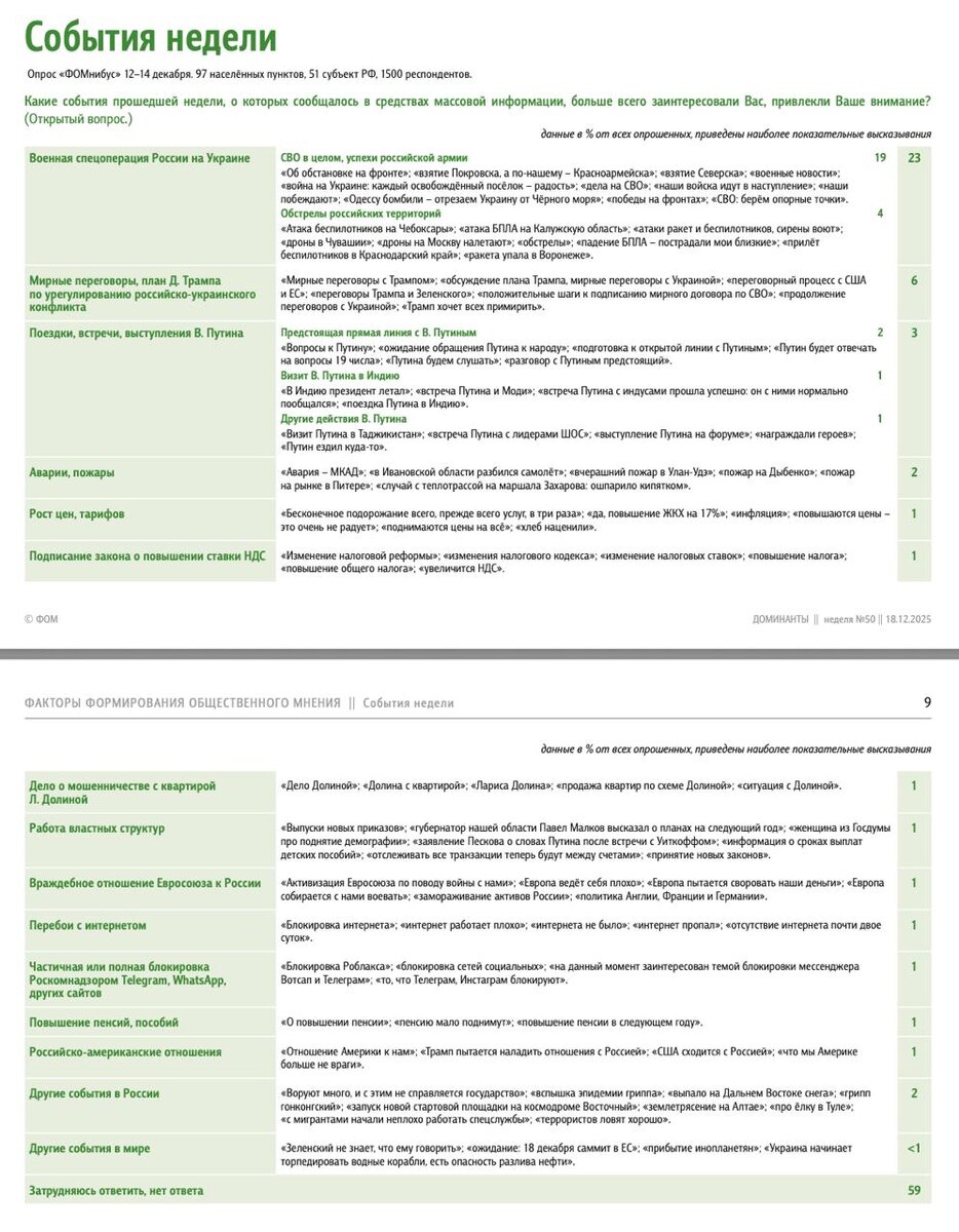 Поле мнений. Выпуск 50 События недели и настроение окружающих Результаты еженедельного опроса 12 – 14 декабря 2025 года. Полный выпуск: fom.ru #доминанты #ФОМнибус 📱 Фонд Общественное Мнение