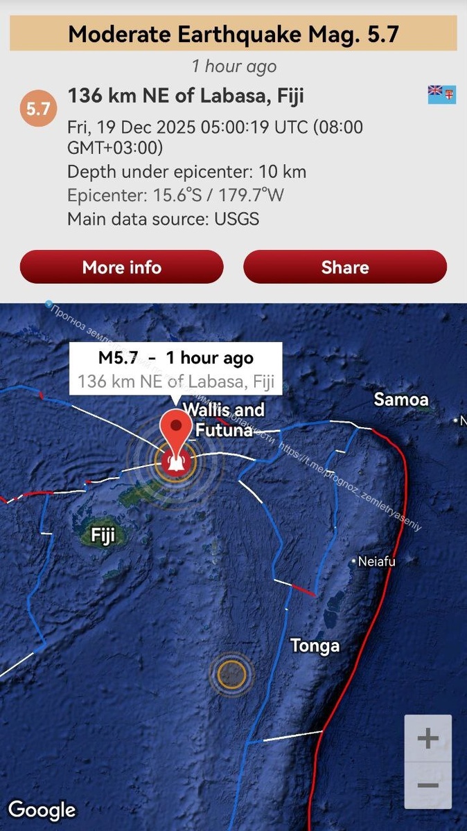 Согласно вчерашнему предупреждению зона между Футуной и Фиджами (Тонгой) отработала землетрясением М5.7 ===== According to yesterday's warning, the area between Futuna and Fiji (and Tonga) was affected by the M5.7 earthquake
