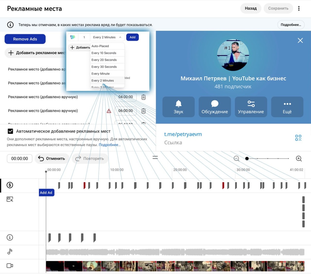 : Длина видео от 8 минут - иначе YouTube не даст расставить рекламные слоты в ролике. Меньше слотов < меньше CPM Больше слотов > больше ваша ЗП в конце месяца С расстановкой рекламы (потому что в ручную раставлять - муть) поможет расширение для Chrome - Nexlev p.s. реклама откручивается не на каждом слоте, это лишь вероятность ее включения --- 📢 Подписывайся на канал, если хочешь больше инсайтов про YouTube Здесь я делюсь реальным опытом, кейсами и стратегиями монетизации, которые работают прямо сейчас