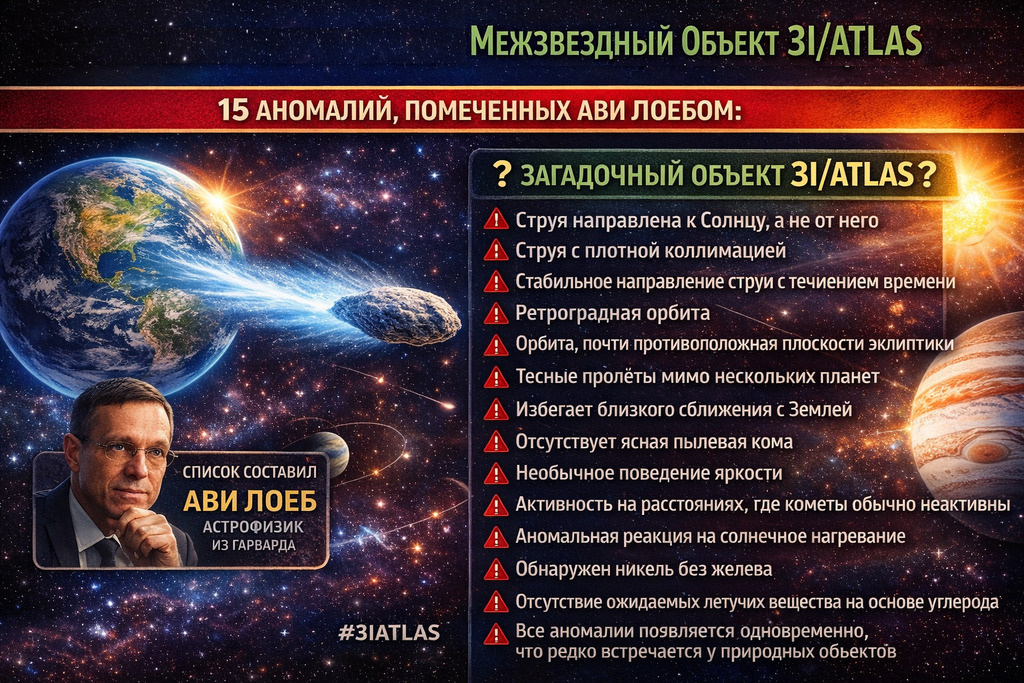 Вот 15 аномалий, отмеченных астрофизиком из Гарварда Ави Лоебом: 1. Струя направлена к Солнцу, а не от него. 2. Струя с плотной коллимацией 3. Стабильное направление струи с течением времени. 4. Ретроградная орбита 5. Орбита, почти противоположная плоскости эклиптики. 6. Тесные пролёты мимо нескольких планет. 7. Избегает близкого сближения с Землей. 8. Отсутствует ясная пылевая кома. 9. Необычное поведение яркости 10. Активность на расстояниях, где кометы обычно неактивны. 11. Аномальная реакция на солнечное нагревание 12. Обнаружен никель без железа. 13. Отсутствие ожидаемых летучих веществ на основе углерода. 14. Поведение струи не объясняется сублимацией водяного льда. 15. Все аномалии появляются одновременно, что редко встречается у природных объектов. Необычное сочетание этих аномалий делает 3I/ATLAS загадочным объектом, за которым ученые внимательно наблюдают. #межзвездный #объект #комета #аномалия #астрофизика #3IATLAS #загадка ✅ ПОЛНЫЕ версии видео тут! ✅ Обсудить новость