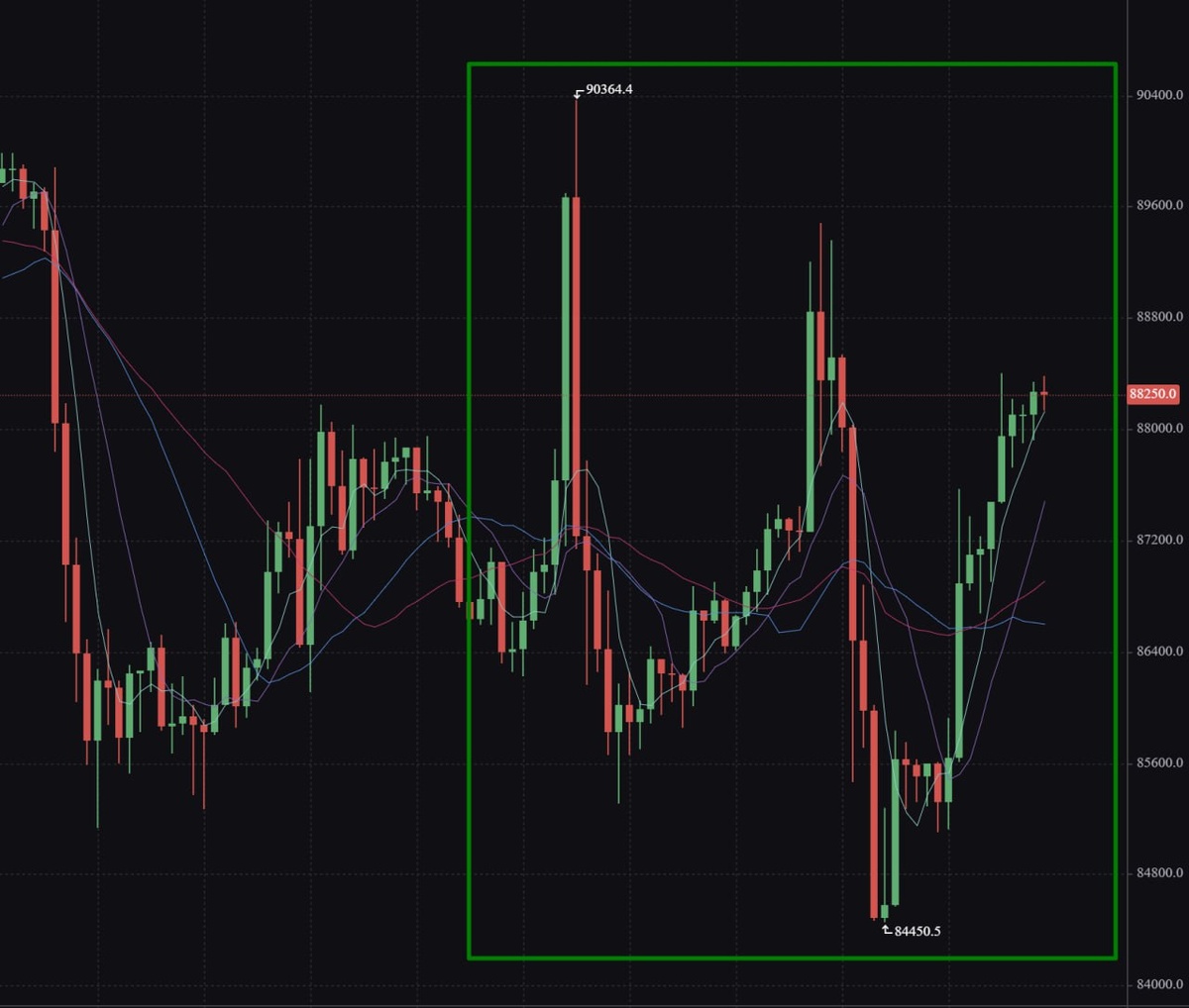 ? Последние дни график BTC напоминает американские горки цена то взлетает, то резко уходит вниз, то есть ведет себя как альта)))) На графике видно, как котировки скачут между уровнями ~84 450 и ~90 364 USD - классический пример высокой волатильности! Такой цикл я уже наблюдал перед: 1️⃣-мощным ростом (бычий рынок, когда после коррекции цена улетает вверх >120k); 2️⃣-глубоким падением (медвежий рынок, когда коррекция перерастает в нисходящий тренд <80). 🤔