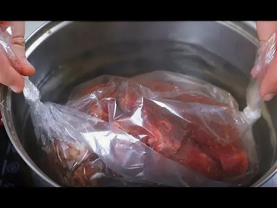 - Поместите мясо в пакет и полностью погрузите в воду.