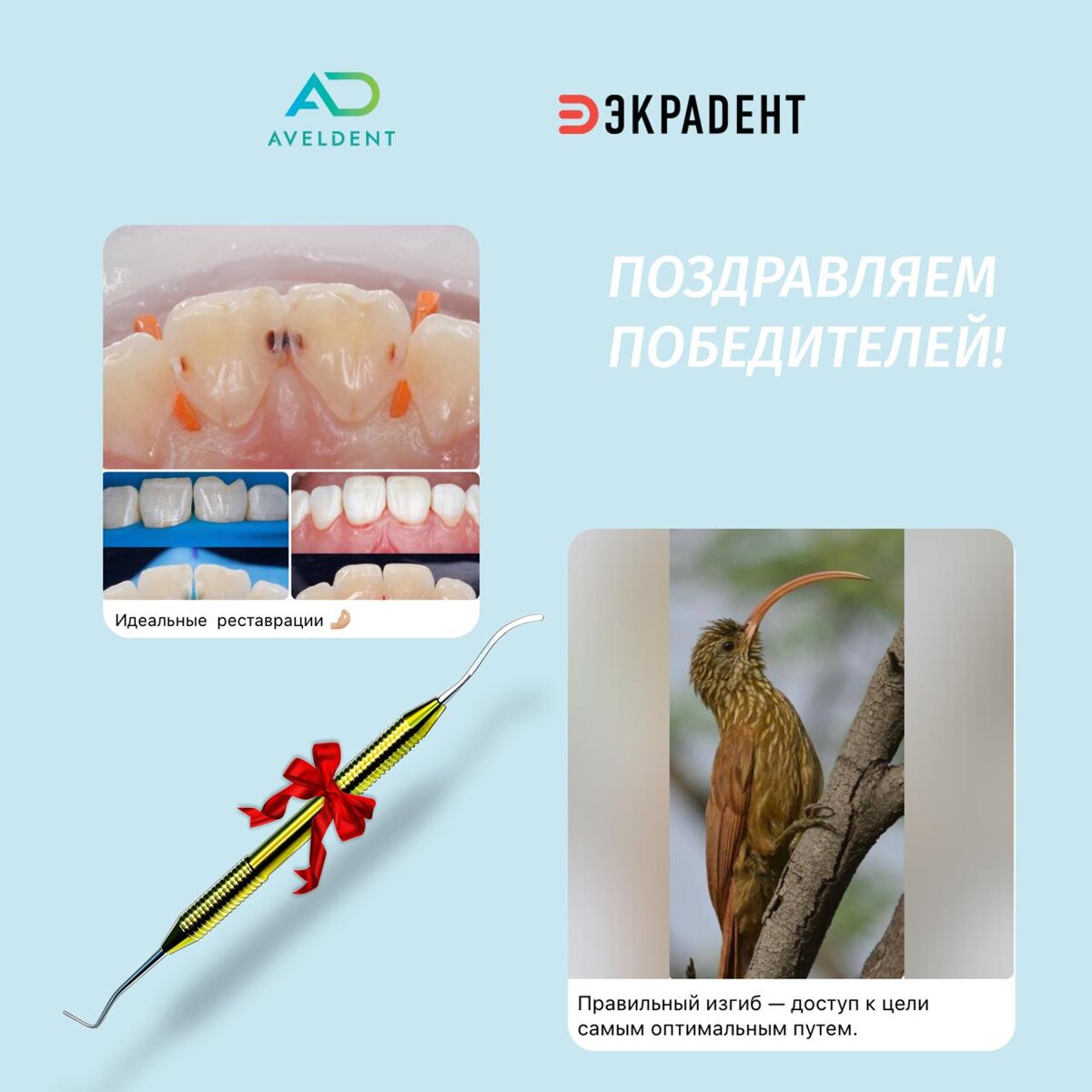 И знаете что? У нас для вас сюрприз! Победителем стал...барабанная дробь… участник, который предложил сравнить инструмент с клювом птицы! 🎉 Поздравляем @doc_reutova, вы выиграли штопфер 04-01! Но это еще не все! Мы не смогли выбрать между двух участников. Поэтому совместно с Экрадент решили наградить еще второго победителя! Для идеальных реставраций – идеальный инструмент! @Faiq_Mamedov_1, вы тоже становитесь обладателем приза 🎉 Уважаемые победители, в ближайшее время с вами свяжется наш представитель для уточнения данных для отправки подарка. Всех благодарим за участие! Впереди у нас еще больше интересных подарков, следите за новостями и проявляйте активность на канале – это значительно повышает шансы на победу!