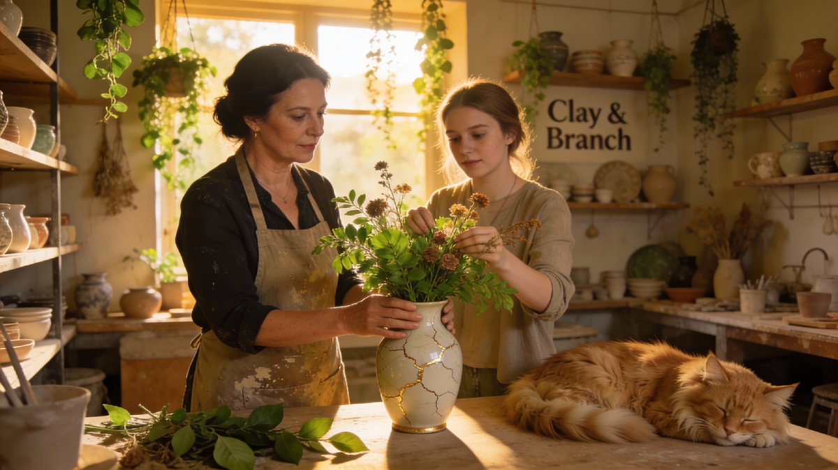 В новой, расширенной мастерской «Глина и Ветвь» пахло свежим кофе, мокрой землей и весной. Пространство было наполнено светом. Анна заканчивала роспись огромной напольной вазы — сложный узор из переплетенных корней и золотых трещин. Лена составляла масштабную композицию из мха и орхидей для холла бизнес-центра. Двухлетний Денис сидел в манеже, увлеченно размазывая глину по листу бумаги — будущий художник.