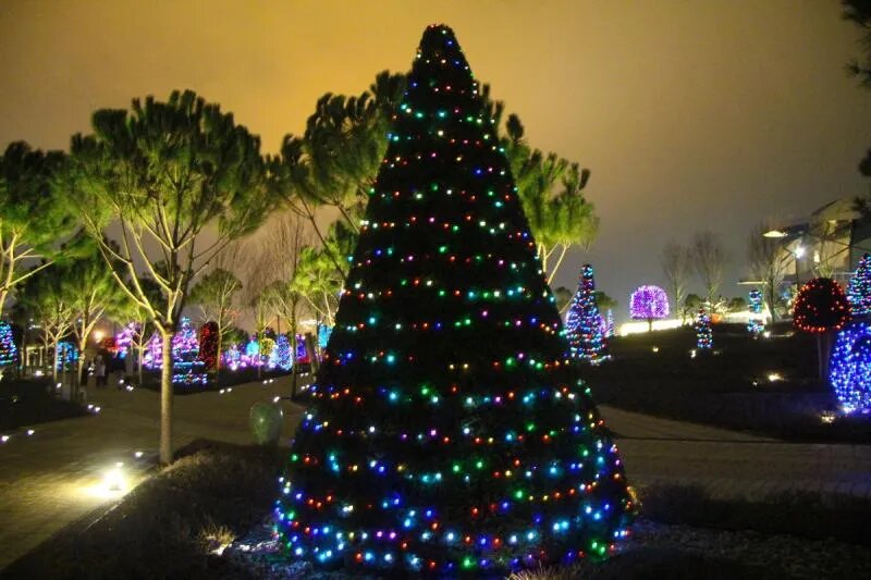 Деревья украшены чудесной новогодней иллюминацией рядом с Японским садом на входе в Парк облаков