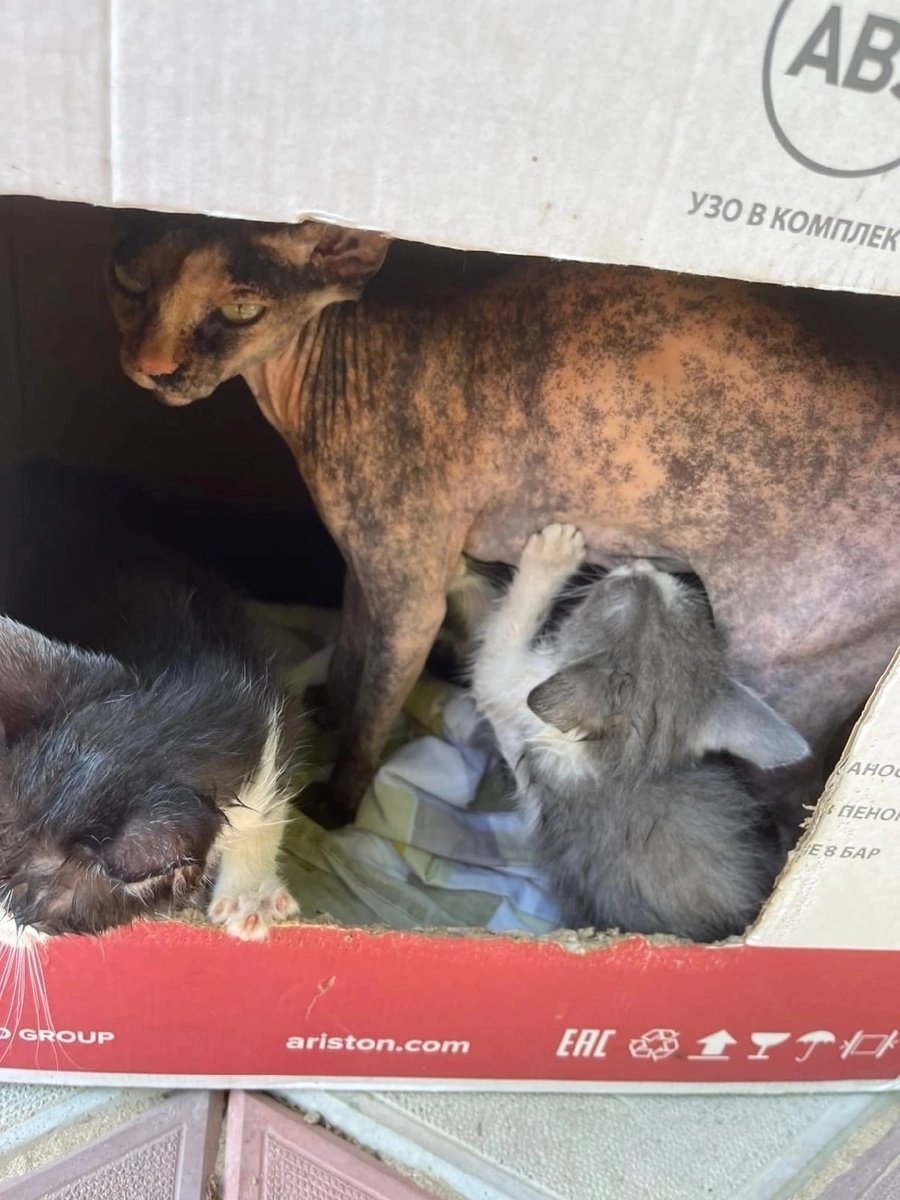 Свою кошку-сфинкса хозяева не стерилизовали и отпускали на самовыгул. На что они расчитывали - непонятно, но в один прекрасный день питомица, ожидаемо, принесла котят. Котятки мало были похожи на маму и, видимо, это сильно не понравилось хозяевам, так как они собрали чуть подросших малышей в пакет, кошку взяли в охапку и подбросили семейство под ворота одной из дач. Оказавшись в незнакомом месте, кошка побежала, куда глаза глядят, а котят, временно, поместили у себя хозяева дачи. Кошка оказалась хорошей мамой, и вскоре уже вернулась и сидела у этих же дачных ворот и истошно кричала, потеряв своих малышей. Ее пустили к детям, она тут же запрыгнула к ним в коробку и принялась их вылизывать, а они, с удовольствием, приступили к трапезе. Оставить пушистиков у себя люди не могли, так как скоро должны были возвращаться в город. К счастью, для семьи нашлась передержка. Сначала, котят было пятеро и возникали некоторые сомнения по поводу родства кошки и котят. А вдруг, она просто приняла чужих