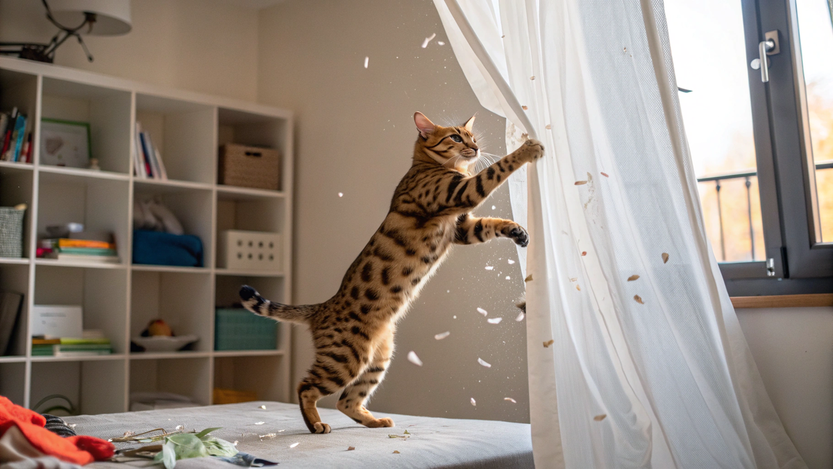 Если вы не играете с бенгалом, он найдёт себе занятие сам. Будет носиться по стенам. Карабкаться на шторы. Прыгать с шкафа на шкаф. Сбрасывать вещи просто чтобы посмотреть, как они падают. Это не агрессия. Это способ израсходовать энергию. Бенгал не виноват. Виноваты вы, если не обеспечили выход этой энергии.