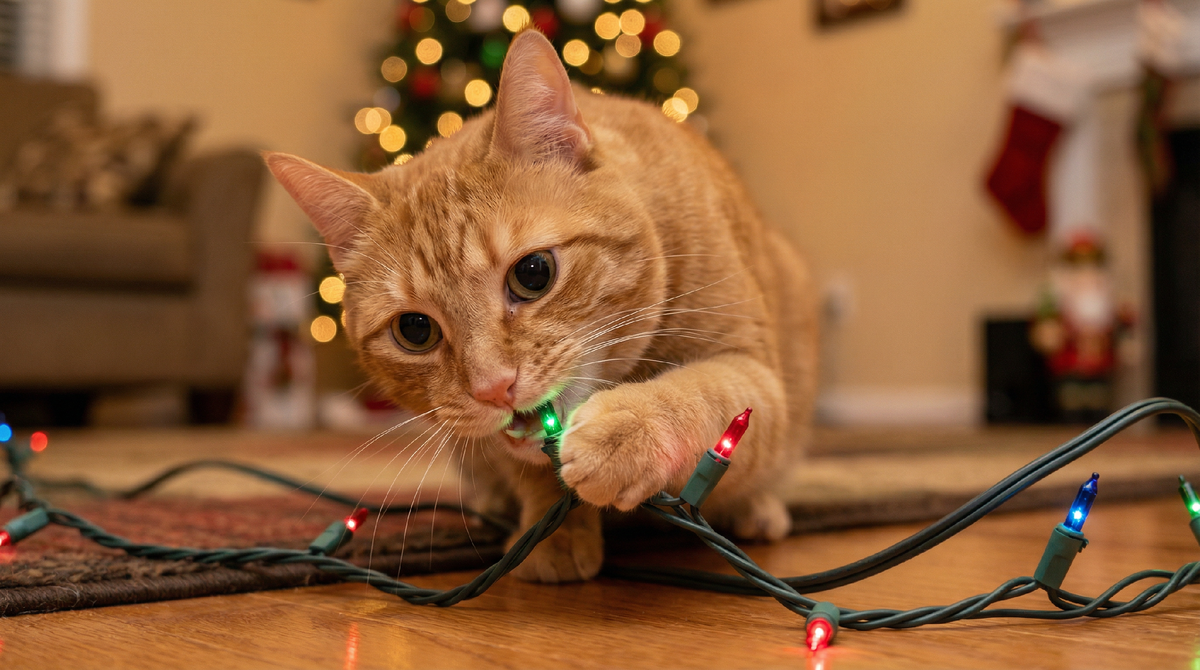 Выключайте гирлянду, когда уходите. Кот может грызть провод и без напряжения — из любопытства. Но риск удара током исключён. Приходите — включаете. Уходите — выключаете. Простое правило, которое работает.