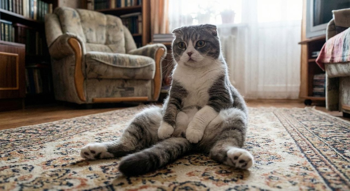 Вы видите фото шотландской кошки. Она сидит на попе. Задние лапы вытянуты вперёд. Передние лапы на животе. Спина прямая. Как человек на полу. Выглядит смешно. Умилительно. Вы думаете: все кошки так могут, просто шотландцы делают это чаще. Нет. Другие породы физически не сидят в такой позе. Или сидят крайне редко. Потому что им неудобно. Больно. Или просто нет причин.