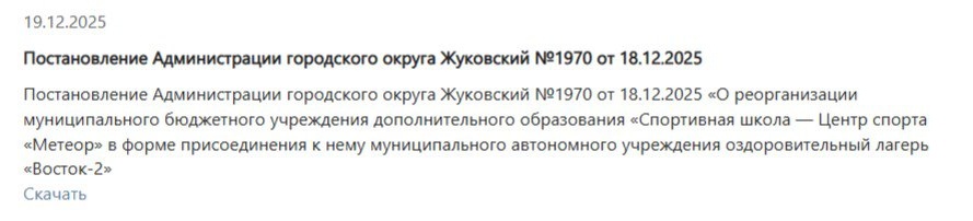 🚩На сайте Администрации размещено Постановление №1970 от 18.12.2025 в срок до 31.03.2026 реорганизовать муниципальное бюджетное учреждение дополнительного образования «Спортивная школа - Центр спорта «Метеор» (далее - МБУ ДО «СШ-Центр Спорта «Метеор») в форме присоединения к нему муниципального автономного учреждения оздоровительный лагерь «Восток-2» (далее - МАУ о/л «Восток-2»).