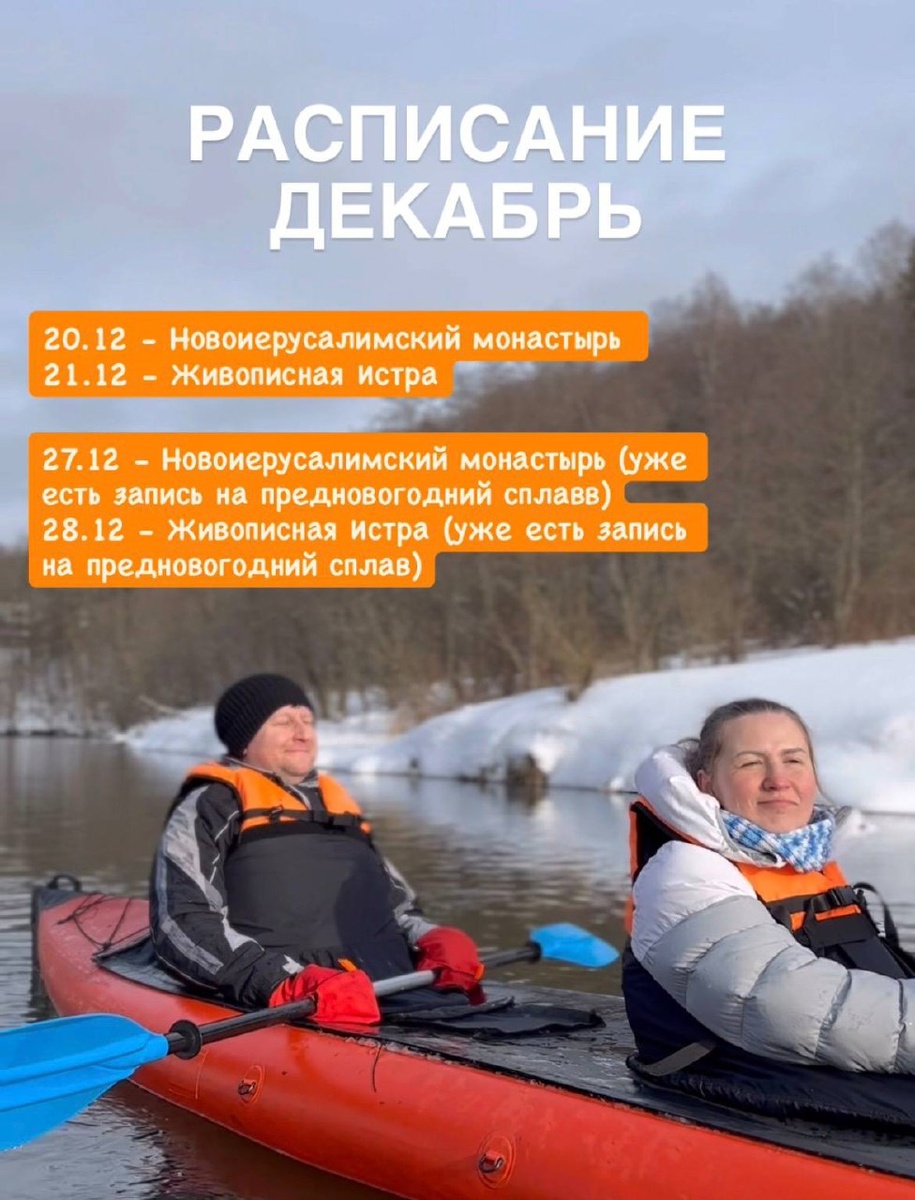 ! 🎅 Готовы к самому волшебному приключению этой зимы? Приглашаем вас на предновогодний сплав, который подарит настоящее праздничное настроение и незабываемые впечатления! Что вас ждет: ✨ Сказочная атмосфера: · На финише вас будет ждать пушистая новогодняя ёлка! · Самый настоящий Дед Мороз отправится с нами в плавание! · Новогодняя музыка будет создавать настроение на всем маршруте. ✨ Комфорт и уют: · Всё включено! Вам нужно только желание праздника. · Нас ждет согревающий горячий обед. · Каждый участник получит сладкий новогодний подарок! ✨ Невероятные виды: · Мы проплывем по одному из самых живописных маршрутов Подмосковья — мимо берегов с историческими видами на Ново-Иерусалимский монастырь. 📅 Расписание декабря: · 20.12 — Ново-Иерусалимский монастырь · 21.12 — Живописная Истра · 27.12 — Ново-Иерусалимский монастырь (предновогодний сплав — уже есть брони) · 28.12 — Живописная Истра (предновогодний сплав — уже есть брони) Подарите себе и близким магию зимы, приключения