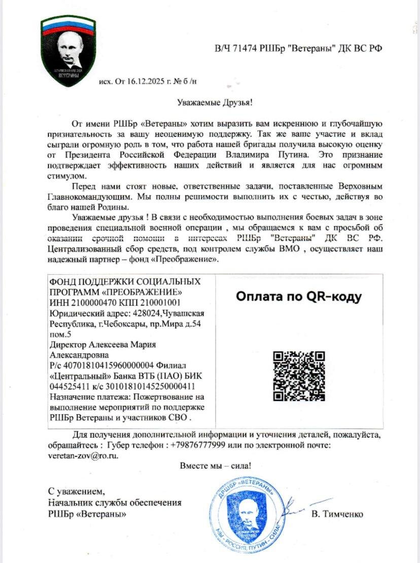 От имени РШБр «Ветераны» хотим выразить вам искреннюю и глубочайшую признательность за вашу неоценимую поддержку. Так же ваше участие и вклад сыграли огромную роль в том, что работа нашей бригады получила высокую оценку от Президента Российской Федерации Владимира Путина. Это признание подтверждает эффективность наших действий и является для нас огромным стимулом. Перед нами стоят новые, ответственные задачи, поставленные Верховным Главнокомандующим. Мы полны решимости выполнить их с честью, действуя во благо нашей Родины. Уважаемые друзья ! В связи с необходимостью выполнения боевых задач в зоне проведения специальной военной операции , мы обращаемся к вам с просьбой об оказании срочной помощи в интересах РШБр "Ветераны" ДК ВС РФ. Централизованный сбор средств, под контролем службы ВМО , осуществляет наш надежный партнер – фонд «Преображение». ФОНД ПОДДЕРЖКИ СОЦИАЛЬНЫХ ПРОГРАММ «ПРЕОБРАЖЕНИЕ» ИНН 2100000470 КПП 210001001 Юридический адрес: 428024,Чувашская Республика, г.Чебоксары, пр