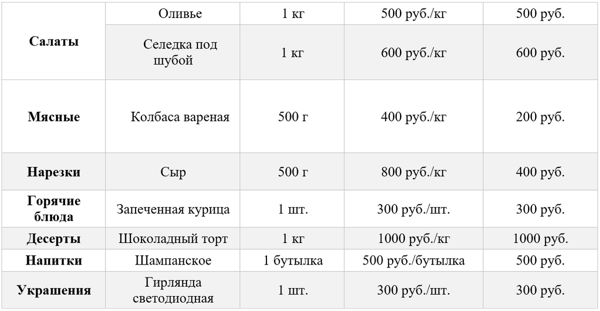 Новый год — праздник, которого ждут взрослые и дети, и одним из главных элементов праздника является праздничный стол. Однако подготовка к нему требует значительных финансовых вложений. Рассмотрим подробнее, как правильно составить бюджет на новогодний стол и учесть все расходы. При составлении бюджета на новогодний стол важно учитывать несколько основных категорий расходов: Для точного расчета стоимости новогоднего стола рекомендуется придерживаться следующего алгоритма: Таким образом, расчет стоимости новогоднего стола позволяет заранее спланировать бюджет и избежать неприятных сюрпризов в виде превышения запланированных затрат.