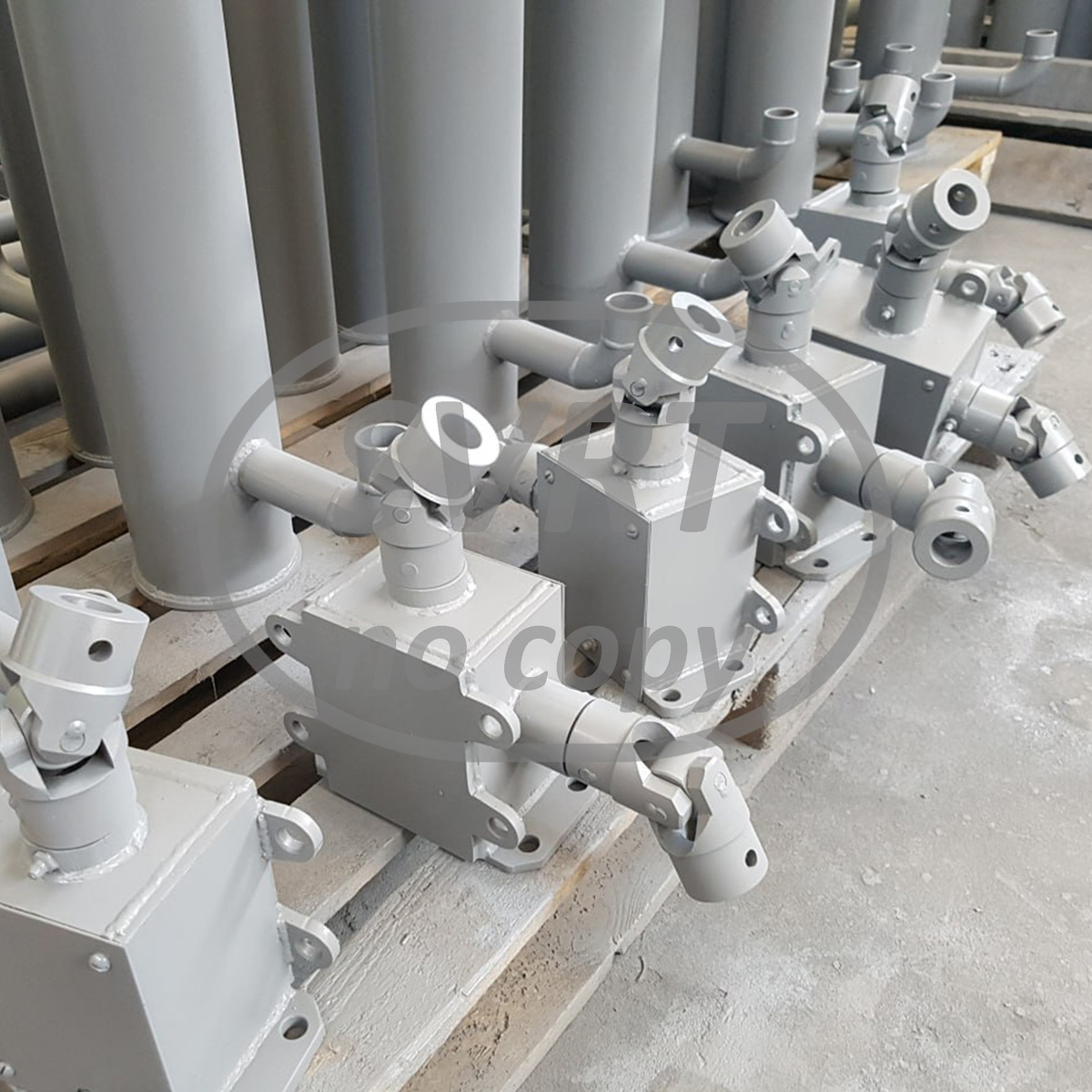 Колонки приводные шарнирные для дистанционного управления арматурой в сложных условиях монтажа Колонки приводные шарнирные (КПШ) являются специализированным решением для организации надежного и плавного дистанционного управления арматурой в условиях сложного или стесненного монтажа. Их ключевое преимущество — способность передавать крутящий момент под углом, компенсируя значительную несоосность между приводом и осью арматуры. Благодаря модульной конструкции на основе шарнирных узлов, компенсаторов и коробок перемены направления, КПШ обеспечивают гибкость кинематической схемы, позволяя обходить препятствия и адаптироваться к реальной геометрии трубопроводов на объекте. Это эффективно решает типичные проблемы, возникающие на энергетических и промышленных предприятиях (ТЭС, АЭС, ГРЭС), где плотная компоновка и сложная пространственная конфигурация сетей часто делают невозможной прямую установку привода на арматуру или приводят к отклонению точки управления от вертикали на 30 и более град