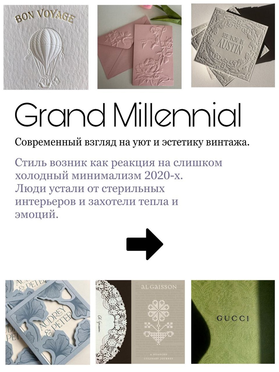 🤩 Пока зумеры внедряли минимализм, миллениалы вернули ретро-стиль. Миллениалам просто надоела вся эта серая эстетика, бесконечный минимализм и глянец. И они решили вернуть ретро-эстетику, но в современной интерпретации. Если простыми словами, то людям просто захотелось какого-то уюта, тепла и добра. И этот стиль получил название — GRAND MILLENNIAL. На упаковках и печатных носителях внедряется рельеф, восковые печати, акварельные переходы, кружево и орнаменты. Уходит глянец и возвращается матовость и текстуры. Шрифты, конечно же, тоже меняются. Уход от четких, суровых минималистичных шрифтов к ретро-шрифтам с засечками. Логотипы в стиле Old Money, похожие на фамильные гербы. Такие логотипы всегда транслируют главную мысль: мы существуем уже давно, у нас есть своя история и эстетика. Даже если вы основали этот бренд неделю назад, будет ощущение, что ему можно доверять. Такой дизайн и упаковка выглядят дорого и привлекают внимание — это что-то необычное, красивое, что жалко выбрасыв
