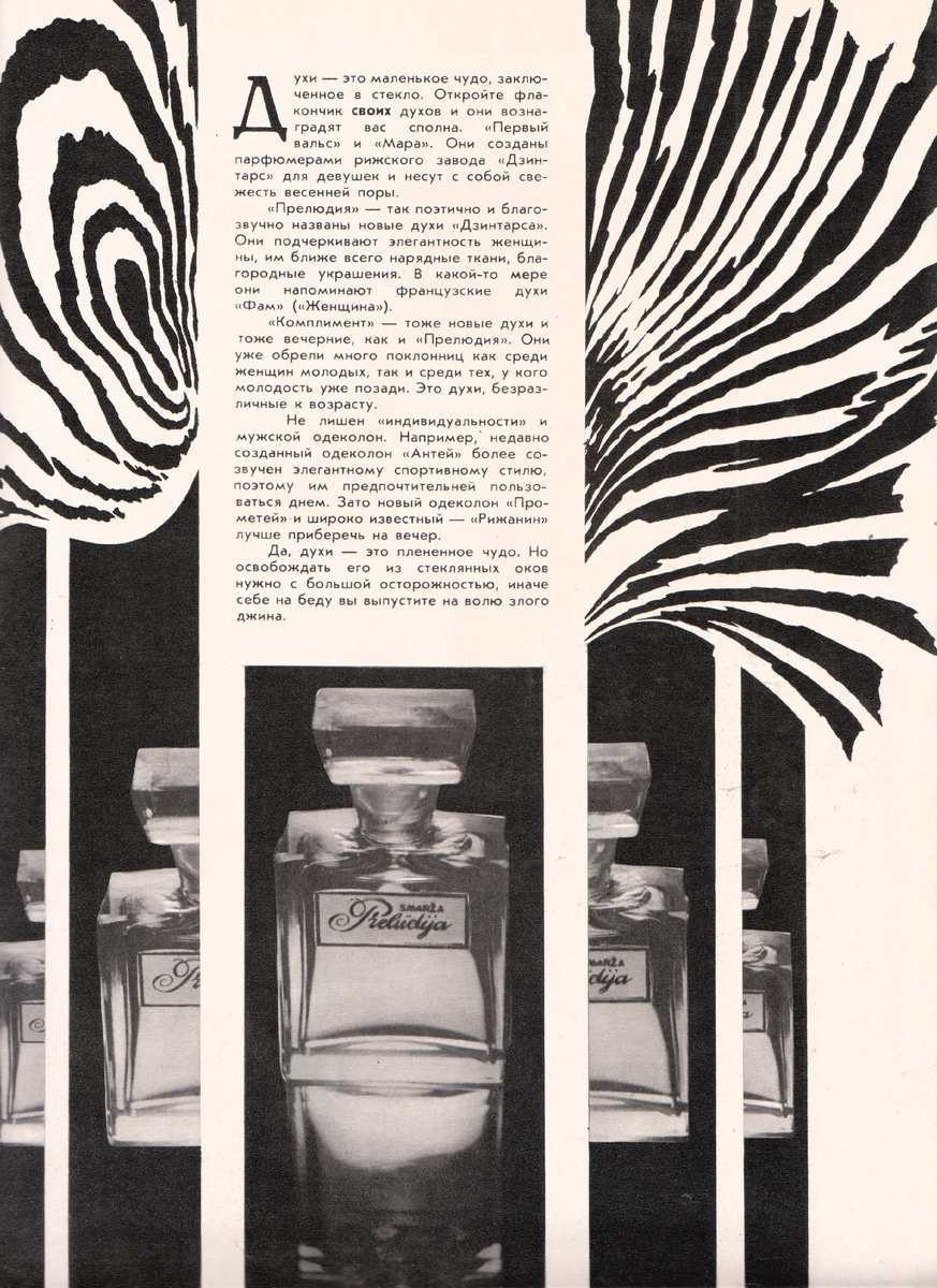 В январском номере 1973 года латвийский журнал Rīgas modes опуликовал рекламу новинок Дзинтарса. Речь в ней шла о нескольких ароматах, но в макет попали фотографии только двух из них: одеколона “Прометей” и духов “Прелюдия”. Эта реклама в Rīgas modes - пока единственное виденное мной изображение “Прелюдии” в советской печати. Как ни странно, ни в одном известном мне экспортном каталоге этих духов нет, в отличие от вышедших тогда же и в точно таких же притертых флаконах “Комплимента” и “Мадригала”. И хотя эти два аромата редки на аукционах, “Прелюдия” встречается еще реже. Даже современных фотографий “Прелюдии” в интернете почти нет. Духи-загадка! Я сама узнала о “Прелюдии” именно из рекламы в Rīgas Modes. Текст рекламы сообщает: “Прелюдия” - так поэтично и благозвучно названы новые духи Дзинтарса. Они подчеркивают элегантность женщины, им ближе всего нарядные ткани, благородные украшения. В какой-то мере они напоминают французские духи “Фамм” (“Женщина”).” Французские “Фамм” - это, не