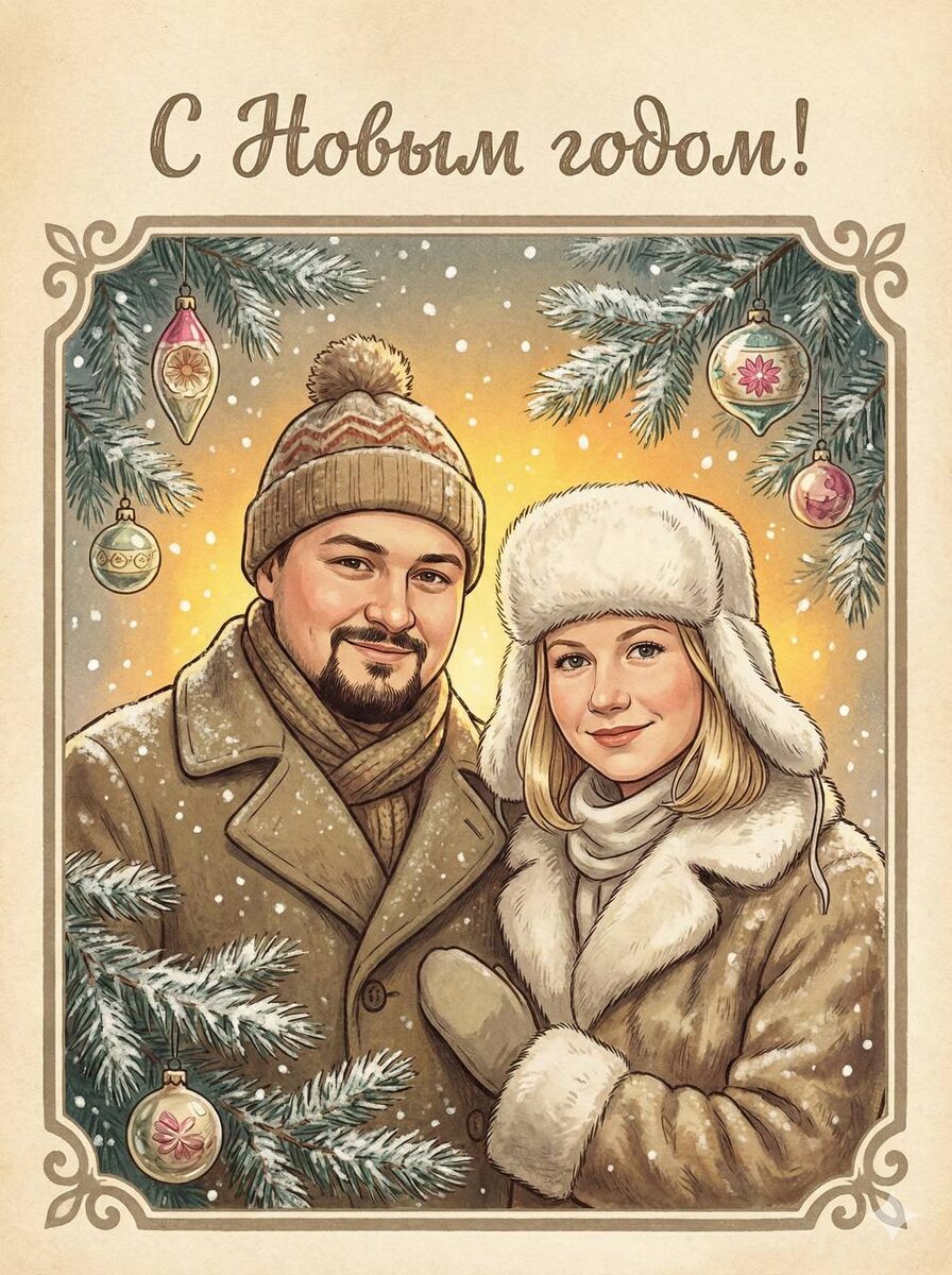 ?🎄 Без лишних слов — инструкция👇 Что понадобится: — ваша фотография — ChatGPT или Gemini — готовый промпт (я оставлю ниже) Как сделать? 1️⃣Выбираем фотографию Лучше всего подойдут: — семейные фото — фото с ребёнком — спокойный кадр без сложных поз и резкого света Важно, чтобы лица были хорошо видны — тогда ИИ сохранит черты максимально точно. 2️⃣Загружаем фото в GPT 3️⃣Добавляем промпт: Создай уютную новогоднюю открытку в стилистике СССР на основе загруженного фото. Сохрани лица и пропорции людей с фотографии, сделай их максимально узнаваемыми и естественными. Одежда и образы: — ребёнок одет в тёплую зимнюю советскую шапку (вязаную или меховую, характерную для СССР), аккуратную и уютную — женщина одета в белую зимнюю советскую шапку (меховую или каракулевую, классического советского фасона), светлую, чистую, без современных деталей — верхняя одежда — плотные советские пальто или шубы классического кроя, шарфы спокойных, тёплых оттенков Композиция как у советской новогодней
