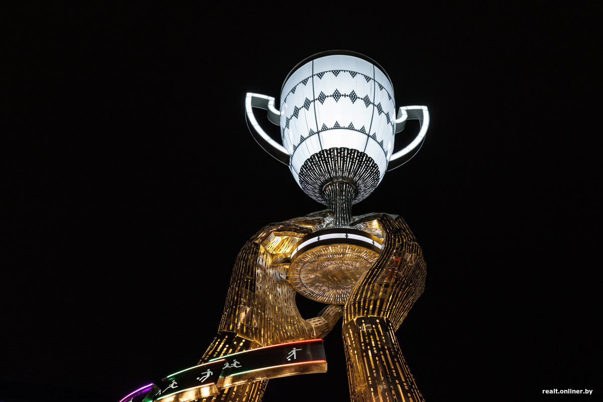 Новогодняя иллюминация — это хорошо. Но уже в конце января от нее не останется и следа. То ли дело постоянные световые фигуры. Зубр, лоси, трактор, шайба с клюшкой, гигантский футбольной мяч — в Минске можно найти что угодно. На днях ряд «ярких и заметных» пополнился новым экземпляром. На установку внушительной фигуры обратил внимание минчанин Вадим. «Эта штука точно загорится огнями невероятной красоты», — предположил читатель (и оказался прав). Монтировали инсталляцию — две руки и кубок — в течение нескольких дней. Пробный запуск подсветки был еще 15 декабря. А сейчас по вечерам «скульптура» горит вовсю. Выглядит впечатляюще. Сама фигура, конечно, и есть подсказка, но все же мы рискнем спросить: как думаете, где она находится? А теперь правильный ответ. Конечно же, фигура украшает территорию возле Национального футбольного стадиона. Вот как она смотрится на фоне светящегося здания. Есть о чем рассказать? Пишите в наш телеграм-бот. Это анонимно и быстро
