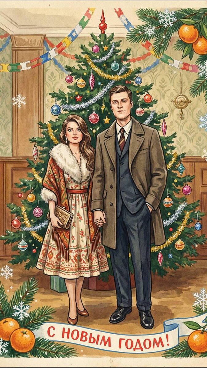❤️🔥 Как вам такие открыточки?👇 Сделано в Nano banano: Промт: Faces should be as similar as possible to the original photo. Keep the exact proportions of faces, individual characteristics of each person. Don’t change the location of the characters. Style: New Year’s drawn Soviet postcard. Interior and clothes in the style of the USSR. Format 9:16 Ссылка на нейросеть в комментариях❤️