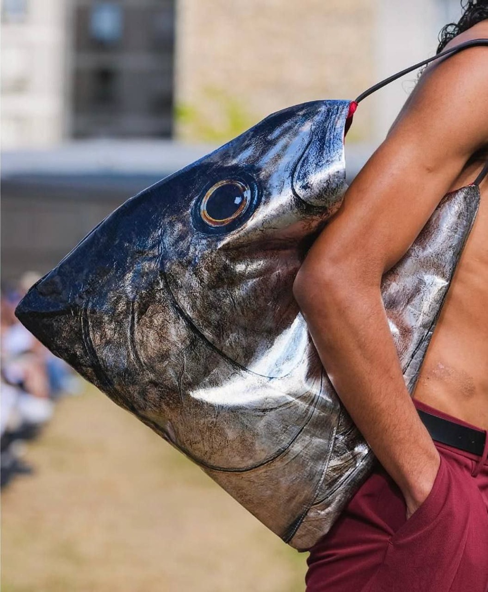 Полнейший восторг вызвала сумка бренда Doublet с головой селедки.