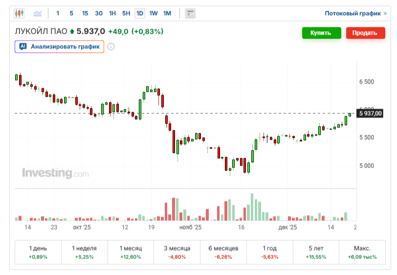 Акции Лукойла очень сильно отошли от достигнутых минимумов. После того, как они всего месяц назад опускались почти до 4800 рублей, сегодня они уже торгуются в районе 5950, движутся к 6000. То есть, выросли более чем на 1000 рублей, или на 24%.