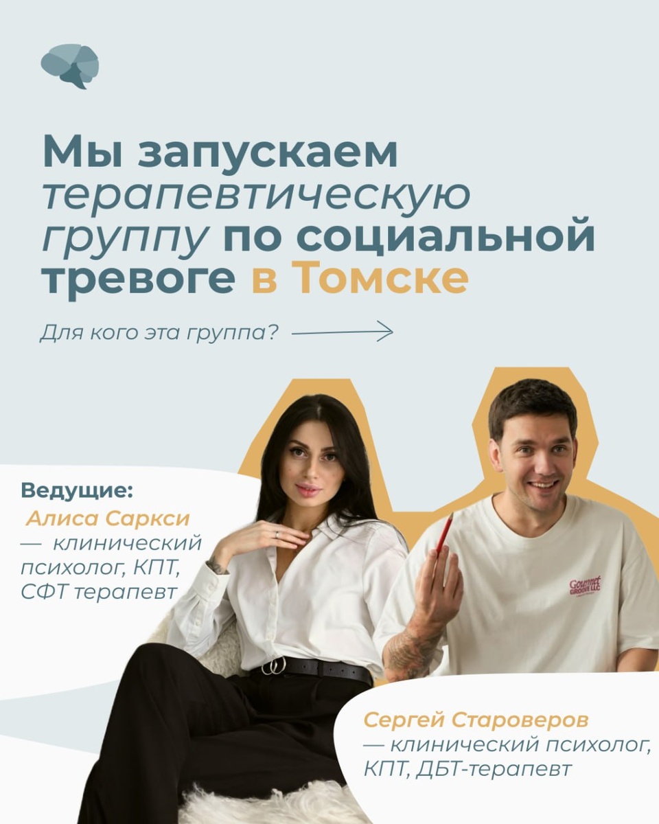 ✨ Мы открываем набор в очную терапевтическую группу в Томске для тех, кто устал от социальной тревоги. Если вам знакомо чувство скованности, страх осуждения или желание спрятаться от посторонних глаз - эта группа для вас. Ведущие - Сергей Староверов и Алиса Саркси. 👆🏻В карточках подробно расписали: 🔵С какими запросами работаем 🔵Как проходят встречи 🔵Стоимость и расписание Старт 24 января. Количество мест ограничено (до 10 человек), чтобы каждому было комфортно. Регистрация по ссылке: https://cnpp.ru/events/sociala/