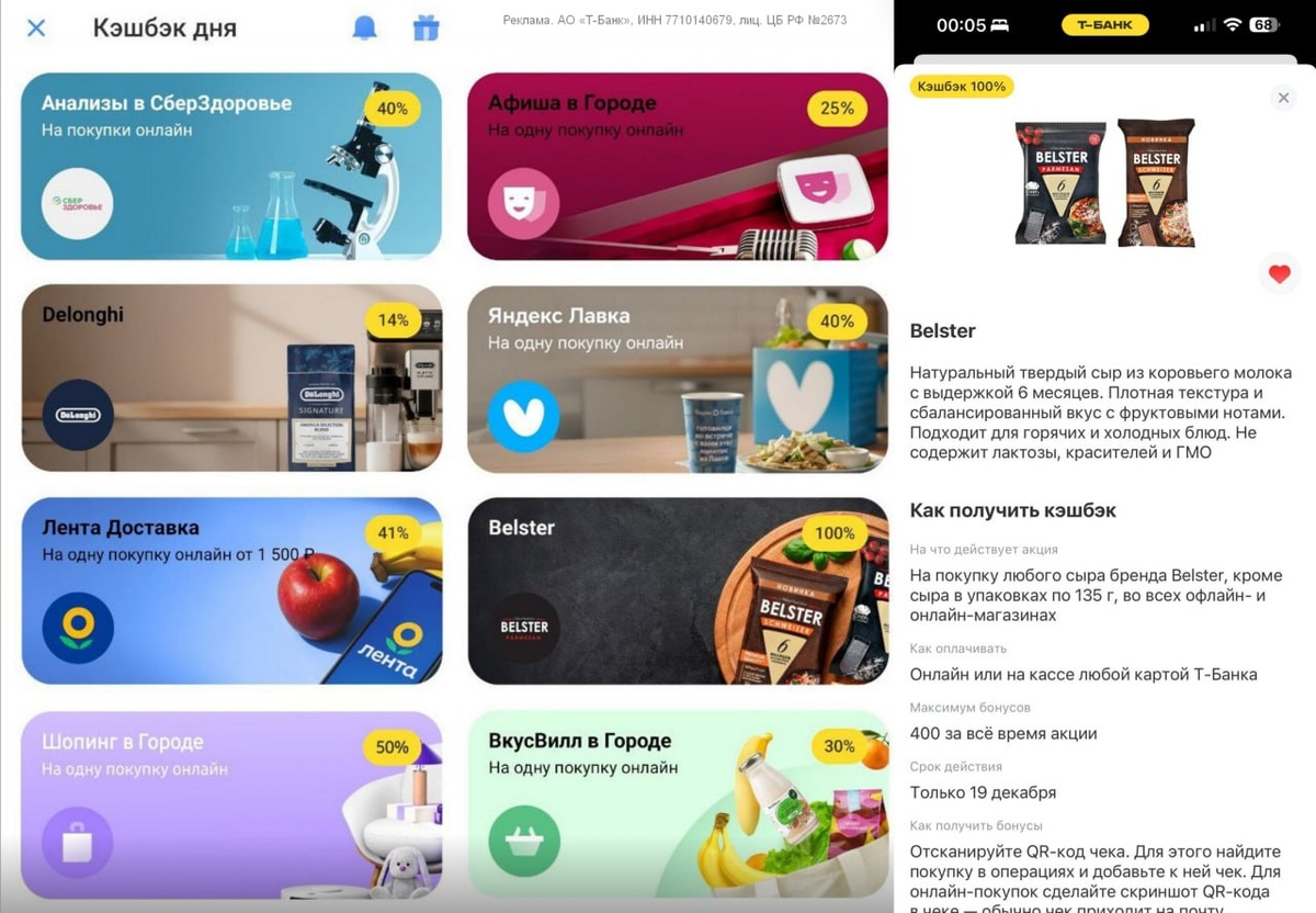 ⚡ Сегодня в кэшбэке дня появился редкий 100% возврат на сыр Belster с лимитом 400 руб. в любом продуктовом магазине. По отзывам пользователей, вкус похож на пармезан. Также в кэшбэке дня могут встретиться: 👑 50% на шопинг в Городе, макс 600 руб. 👑 41% на Лента Доставка от 1500 руб., макс 750 руб. 👑 40% на анализы в СберЗдоровье. 👑 40% на Яндекс Лавку, макс 350 руб. 👑 30% на ВкусВилл в Городе, макс 800 руб. 👑 20-25% на Афишу в Городе, макс 300 руб. 👑 14% на Delonghi, макс 20000 руб. ◻️ У части клиентов замечен повышенный кэшбэк в Перекрестке и Пятерочке (в т.ч и в Городе). Проверяйте у себя. ✈️ Подписаться | 📊 Все акции