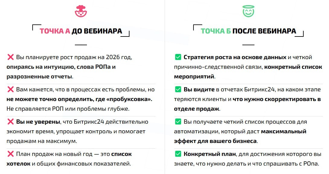 ! Хотите запланировать рост продаж на 2026? Или вам нужно удержать продажи в осложнившейся обстановке? Пытаетесь опереться на интуицию и ставить планы “по прикидкам”? Не рекомендуем - продажи это система и цифры. Нужен анализ и конкретный план действий. 23 декабря в 🕚11:00 (мск) на бесплатном вебинаре Ольга Жукова расскажет: 🔺Какие 15 ключевых точек системы управления продажами нужно проверить. 🔺Как это сделать с помощью Битрикс24. 🔺Как перейти от диагностики и цифр к действиям и составить конкретный пошаговый план. Кому будет полезно: ✔️ Собственникам бизнеса ✔️ Топ-менеджерам ✔️ Руководителям отделов продаж Продолжительность: 30-40 минут + ответы на вопросы. 👉 Забронируйте место сейчас: https://kit-media.ru/checkup_sales2026_Bitrix24/