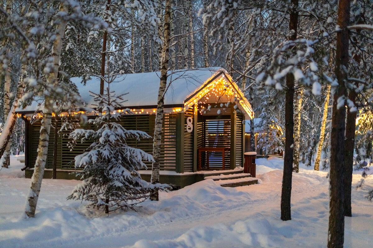 В преддверии праздников гостиничный комплекс «Ямская слобода», который находится на территории природного парка «Ямской лес», преображается: мягкое сияние гирлянд освещает основной корпус гостиницы и уютные деревянные домики кемпинга и глэмпинга, подчёркивая красоту зимнего леса.