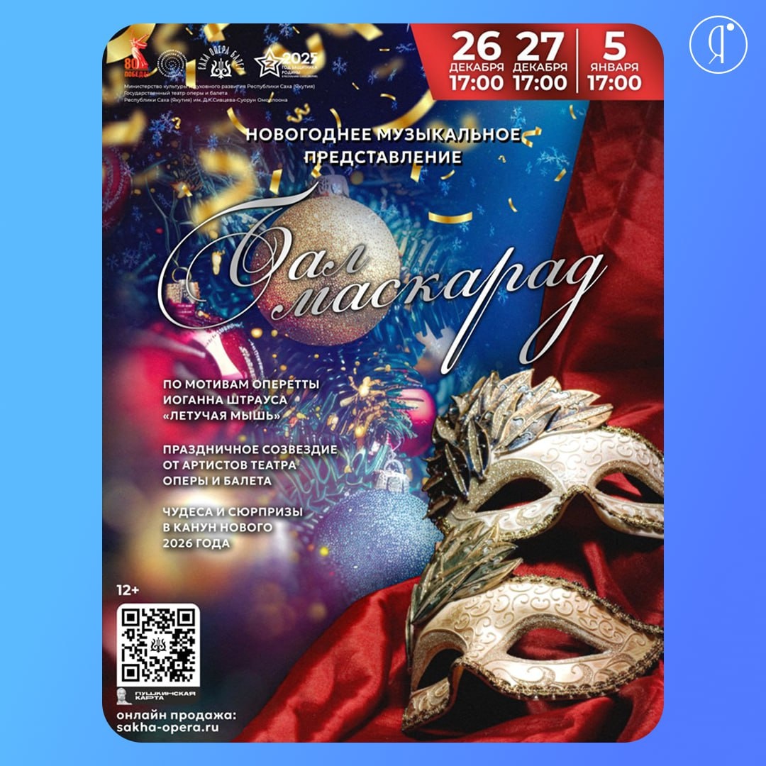 #Концерты Вас ждёт блестящая и искромётная музыка Иоганна Штрауса из знаменитой оперетты «Летучая мышь» Программа вечера включает: 🎶 Музыкальные номера в исполнении звёздных солистов и артистов театра. 🤝 Праздничный интерактив А также: - Подарки от звезд театра - Поздравление от самого Деда Мороза - Конкурс маскарадных костюмов с призами - Дискотека под лучшие мелодии - Волшебные фотозоны Дресс-код: нарядный праздничный костюм или маскарадный образ! 26,27 декабря и 5 января | 17:00 Театр оперы и балета, Ленина, 46 1500 руб. Подробнее Online Якутия | Ждем вас в МАХ