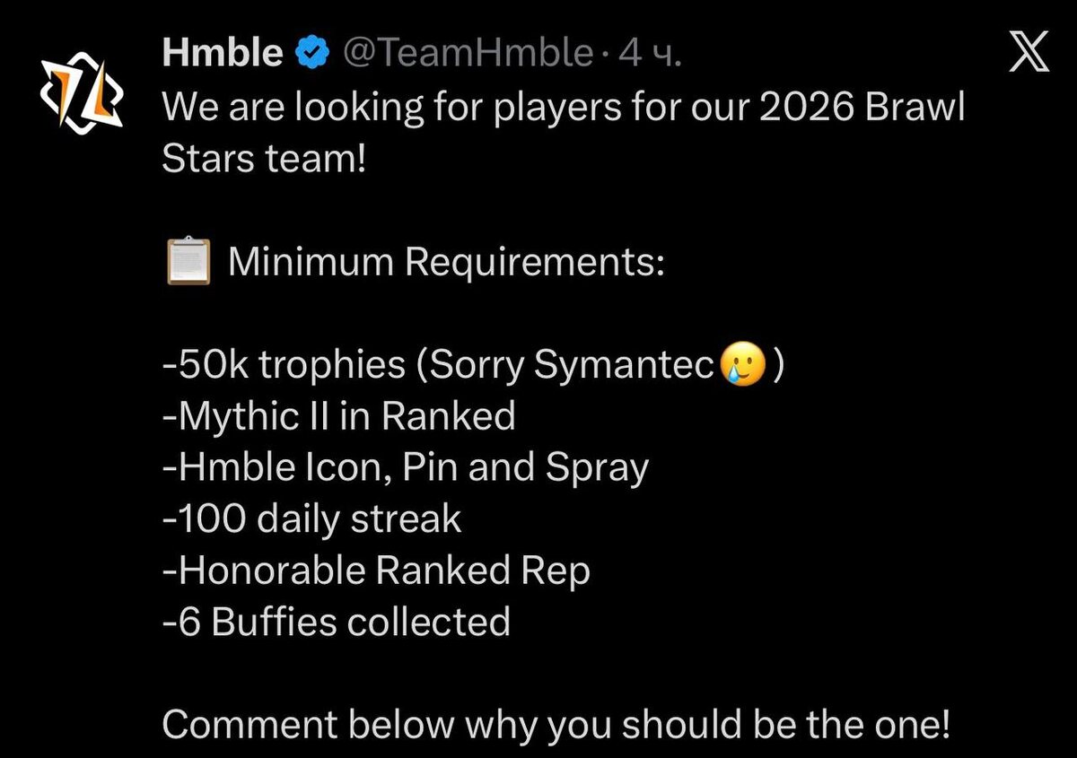 HMBLE набирает новых игроков в свой состав, условия сложноваты, но попытаться стоит. Действуем, это шанс попасть в киберспорт: — минимум 50000 трофеев; — 3 мифик в лиге; — наличие косметики команды на аккаунте; — стрик минимум из 100 заходов в игру; — 6 собранных баффи. ✅Новости по Clash Royale - ТЫК 😌Новости по Roblox - ТЫК Мир Supercell. Подписаться