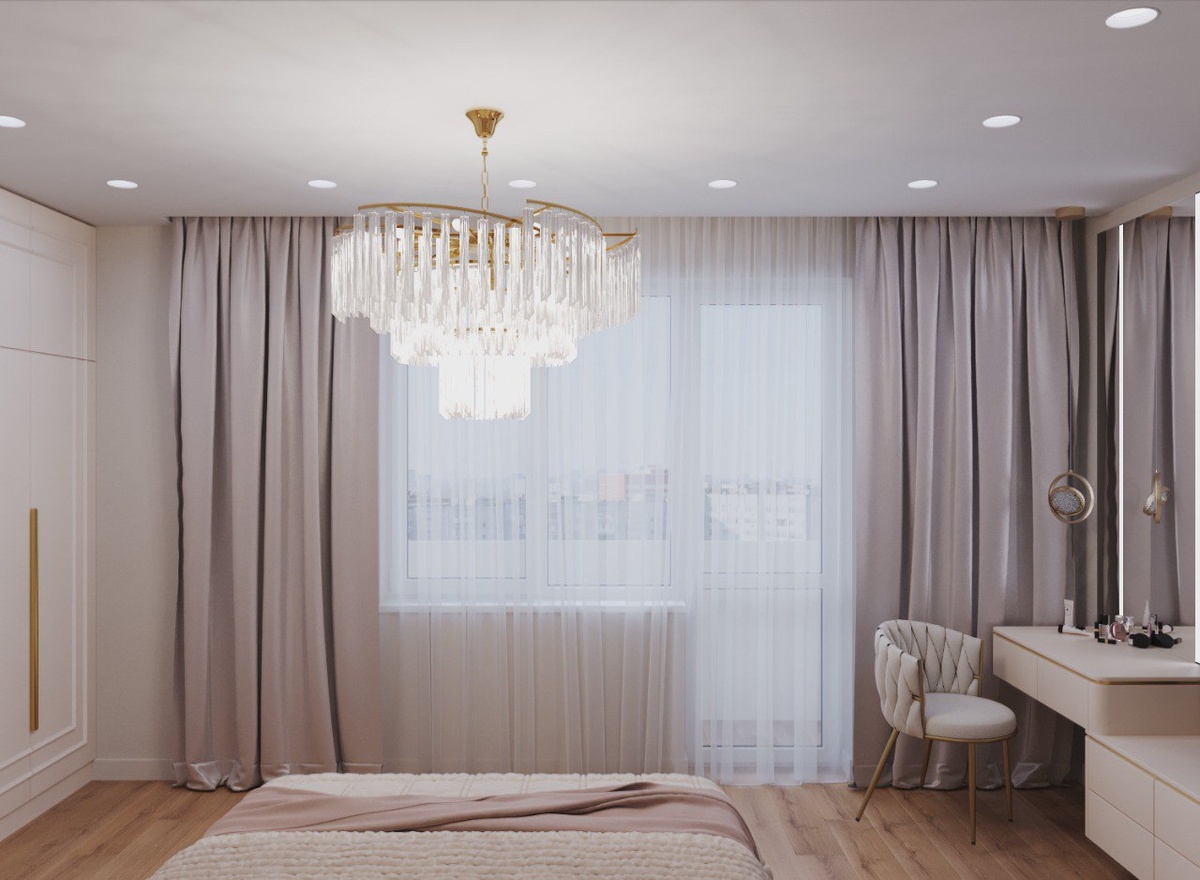 💫В этом интерьере я стремилась создать атмосферу уюта и спокойствия. Пастельные тона в сочетании с золотистыми акцентами придают пространству элегантность и изысканность. 💫Центральным элементом спальни является кровать с белым стёганым покрывалом и двумя большими белыми подушками. Небольшая коричневая подушка добавляет мягкость и уют. Мягкое изголовье розового цвета, разделённое золотистыми линиями на геометрические фигуры, становится ярким акцентом и при этом гармонично вписывается в общий дизайн. 💫Прикроватные тумбочки с мраморными столешницами по обе стороны от кровати не только функциональны, но и визуально дополняют интерьер. Декоративные предметы на них, такие как книги и шкатулки, придают комнате индивидуальность. 💫Большая люстра с золотистым каркасом и множеством прозрачных элементов создаёт мягкий и равномерный свет, подчёркивая элегантность интерьера. Зеркала по бокам от изголовья визуально увеличивают пространство и придают ему глубину. 💫Паркет из светлого дерева на