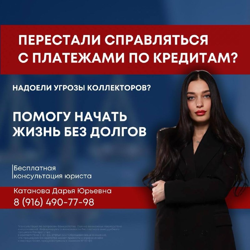 Чем вам поможет ГРАМОТНЫЙ ЮРИСТ? ✅Подскажет, как корректно написать заявление на процедуру, чтобы суд не вернул его обратно; ✅Соберет все необходимые документы в короткий срок; ✅Знает, на что обратит внимание судья, и каких действий с имуществом и доходом лучше избежать; ✅Соберет доказательства и защитит ваши права в суде; ✅Поможет выбрать финансового управляющего, от которого зависит весь путь банкротства и его исход; ✅Оценит вероятность списания долга. Поэтому выбор в пользу юриста очевиден. Я точно знаю, как вам помочь. Пишите ⤵️ 👤Катанова Дарья Юрьевна ✔️ТГ: https://t.me/dariakatanova 🔗 Написать мне в VK: https://vk.com/id153614916 📞 Телефон: 89164907798 *Федеральный закон № 127-ФЗ «О несостоятельности (банкротстве)». Реклама Катанова Дарья Юрьевна ИНН: 504308722842