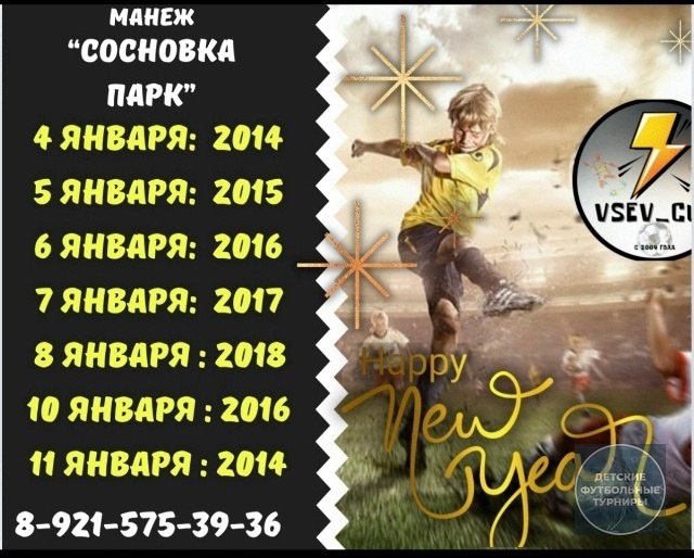В период с 4 по 11 января Приглашаем Вас принять участие в турнирах VSEV CUP Проводим красочно и спортивно время на Новогодних каникулах Вас ждут яркие фото отчеты, объективное судейство, ценные призы от партнёров,музыкальное сопровождение и много положительных эмоций Время начала соревнований будет согласовано чуть позже Подать заявку можно в личные сообщения или по тел.: 8-921-575-39-36 -— #ФутбольныйТурнирЯнварь2026 #ФутбольныйТурнирСевероЗапад2026 #ФутбольныйТурнирСанктПетербург2026 #ФутбольныйТурнирСпб2014гр #ФутбольныйТурнирСпб2015гр #ФутбольныйТурнирСпб2016гр #ФутбольныйТурнирСпб2017гр #ФутбольныйТурнирСпб2018гр