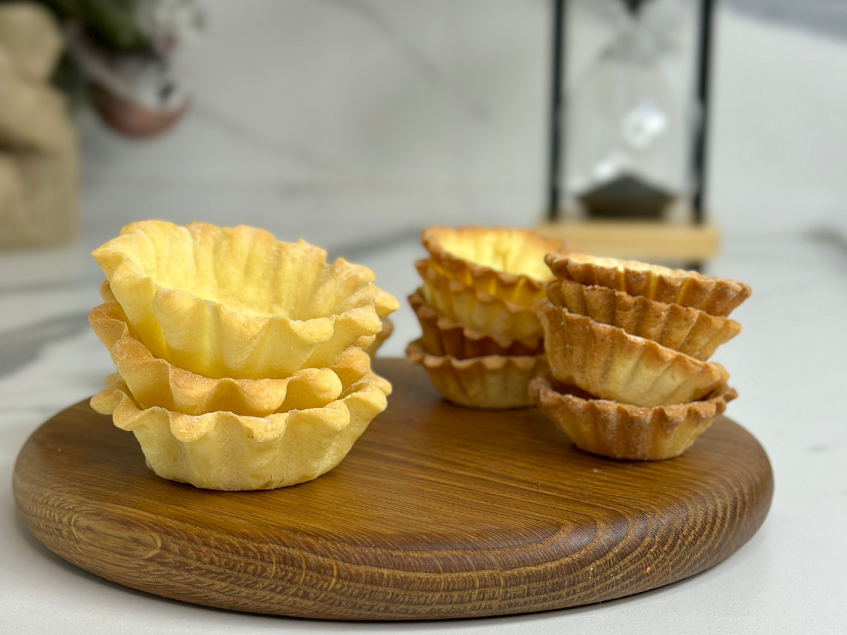 Подъём теста строго контролируется: используется минимальное количество сахара, короткая расстойка и обязательные проколы вилкой. Поэтому тарталетки не вздуваются, а сохраняют тонкую форму. Дополнительный плюс такого теста — оно дольше остаётся хрустящим и не черствеет слишком быстро.