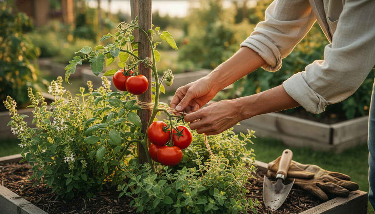 Чтобы не было ощущения «всё просто и без нюансов», пару слов о болезнях и мифах. Орегано не заменяет обработки, когда погода подталкивает фитофтору. Да, бордюр трав помогает подсушивать поверхность, да, вокруг больше божьих коровок и хищных ос, но если над грядкой неделями висят прохладные туманы, нужна профилактика, проветривание, иногда и фунгицид по инструкции. Базилик, наоборот, может страдать от переувлажнения, а у томата, если загустить центр, быстро возникает сырость и серая гниль. Поэтому центральный кол, аккуратное пасынкование и мульча тонким слоем — не дань эстетике, а рабочие мелочи.
