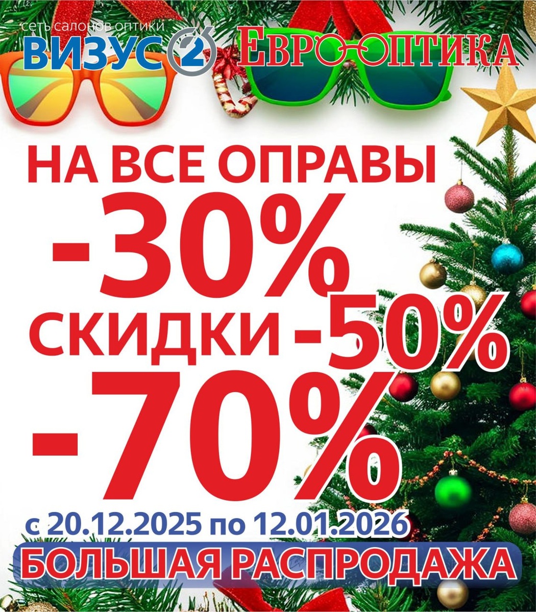 ! ✨ Сеть салонов «Визус‑2» и салон «ЕвроОптика» (ул. Кирова, 16) объявляют БОЛЬШУЮ НОВОГОДНЮЮ РАСПРОДАЖУ на все оправы! 🎁 Что вас ждёт: скидки от 30 % до 70 % на весь ассортимент оправ; Выгодно: сэкономите до 70 % на новой оправе! Своевременно: подберите идеальный аксессуар к новогодним образам. 📅 Сроки акции: с 20.12.2025 по 12.01.2026 📍 Где искать волшебство: сеть салонов «Визус‑2» https://2gis.ru/kemerovo/search/%D0%BE%D0%BF%D1%82%D0%B8%D0%BA%D0%B0%20%D0%B2%D0%B8%D0%B7%D1%83%D1%81%D0%B2/firm/704215722756780/86.142267%2C55.34423?m=86.113231%2C55.346333%2F10.79; салон «ЕвроОптика» — ул. Кирова, 16. 💫 Не упустите шанс: обновить гардероб стильными очками; сделать себе или близким шикарный предновогодний подарок; сэкономить на качественной оптике. 🎅 Спешите! Количество товаров по акции ограничено, а новогодние скидки не вечны! 📲 Узнайте больше: позвоните по телефону +7384278-01-01; зайдите на сайт https://vizus-2.ru/