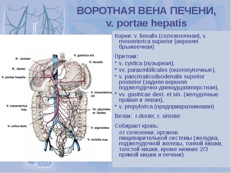 Воротная вена собирает кровь от непарных органов брюшной полости и несёт её в печень — «второй капиллярный круг» для метаболической фильтрации. Образуется у шейки поджелудочной из слияния v. mesenterica superior и v. splenica (к которой часто впадает v. mesenterica inferior). Главные притоки, которые нужно уметь назвать: • Верхняя брыжеечная — тонкая кишка, правая половина толстой. • Селезёночная — селезёнка, короткие желудочные, левая желудочная. • Нижняя брыжеечная (чаще в селезёночную) — левая половина толстой. • Параумбиликальные — связь с передней брюшной стенкой. Что спросят на зачёте: — где формируется и куда идёт; — зоны портокавальных анастомозов; — последствия портальной гипертензии (варикоз пищевода, «голова медузы», геморроидальные кровотечения). Мнемо: «ВеСеН-П» — Верхняя брыжеечная, Селезёночная, Нижняя брыжеечная, Параумбиликальные. 👉 Закрытый клуб | Анатомия