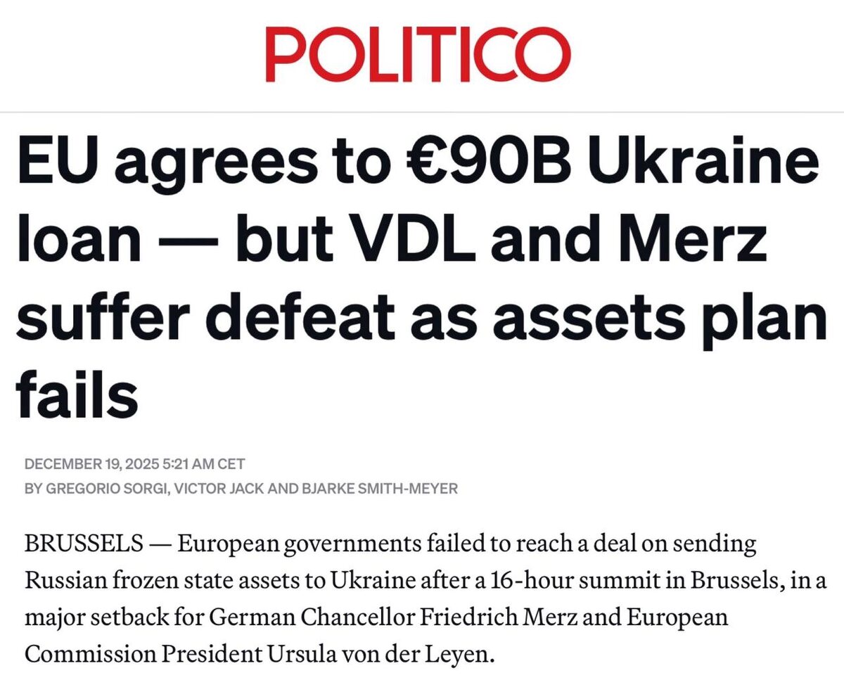 Многочасовой саммит в Брюсселе закончился провалом плана, который активно продвигали Урсула фон дер Ляйен и канцлер Германии Фридрих Мерц. Юридические риски и отсутствие консенсуса оказались сильнее политических заявлений, и от идеи немедленного использования российских средств пришлось отказаться. Вместо этого Евросоюз согласовал временное решение на основе совместных заимствований. Речь идёт о кредите Украине в размере 90 млрд евро сроком на два года, который будет обеспечен бюджетными резервами ЕС и привлечён на рынках капитала. Такой механизм рассматривается как экстренная мера для предотвращения финансового кризиса в украинской экономике, но он не соответствует тому сценарию, на котором настаивали Берлин и Еврокомиссия. Итог саммита стал политическим поражением для Мерца и фон дер Ляйен и победой премьер-министра Бельгии Барта де Вевера. Именно бельгийская позиция сыграла ключевую роль в блокировании схемы с российскими активами, значительная часть которых находится под юрисдикц